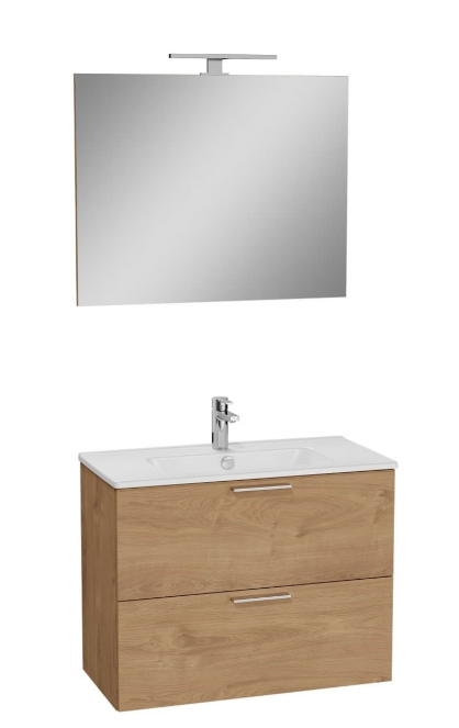 Sestava VitrA Mia o rozměrech 79x61x39,5 cm zahrnuje umyvadlo, zrcadlo a osvětlení, což zajišťuje funkčnost i estetiku.